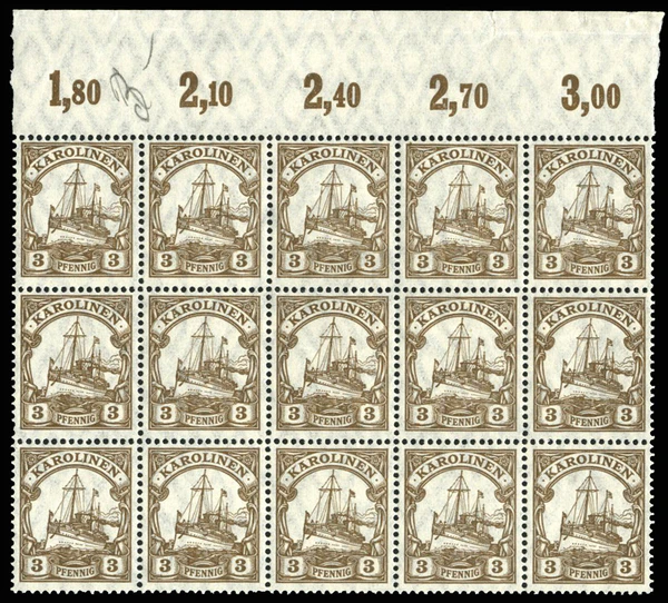 Помимо выпусков «Яхт» 1900—1905 годов без водяных знаков, эксперты различают два более поздних выпуска с водяными знаками «ромбы» — тиражи 1905—1914 годов («мирного времени», нем. Friedensdruck) и 1915—1919 годов («военного времени», Kriegsdruck). Они отличаются зубцовкой и другими мелкими признаками, при этом более ранние варианты оцениваются на аукционах дороже. Кроме того, ценятся гашёные экземпляры с водяным знаком «ромбы», прошедшие колониальную почту, — поскольку их значимая часть попросту не успела до войны достичь мест своего назначения, либо использовалась там короткое время, такие марки относительно редки (и активно подделываются)[22][23].