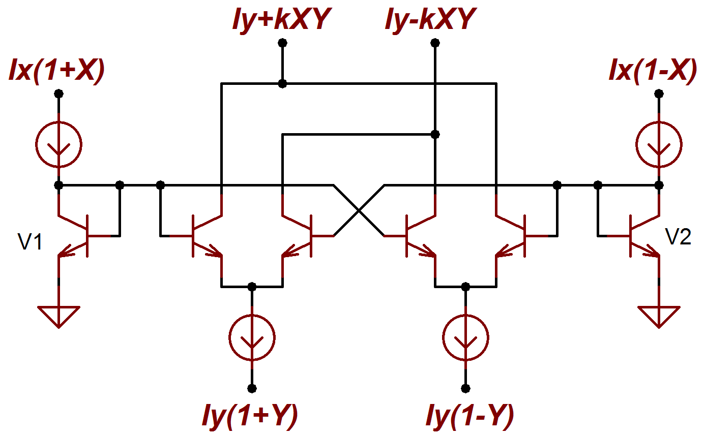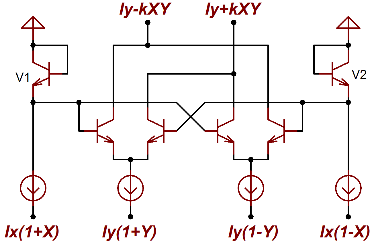 Проблемы этого типа умножителя могут быть в основном решены применением диодных преобразователей входных напряжений — в токи. Схема, полностью управляемую токами, становится линейной (по крайней мере, теоретически), и практически независимой от влияния температуры.