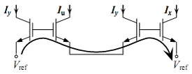 Сосредоточившись на анализе свойств замкнутых контуров, образованных эмиттерными переходами V1, V2 и дифференциальных каскадов, Гилберт пришёл к концепции транслинейной схемотехники и вывел принцип транслинейности (впервые опубликован в 1975[21])[22].
