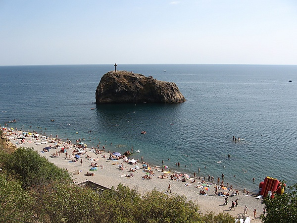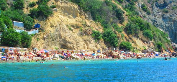 Пляж представляет собой узкую полосу длиной 450 м[1] из мелкой гальки всевозможных цветов[3] под обрывом высотой свыше 150 м, отличается чистой водой и живописными пейзажами[1][4][5].