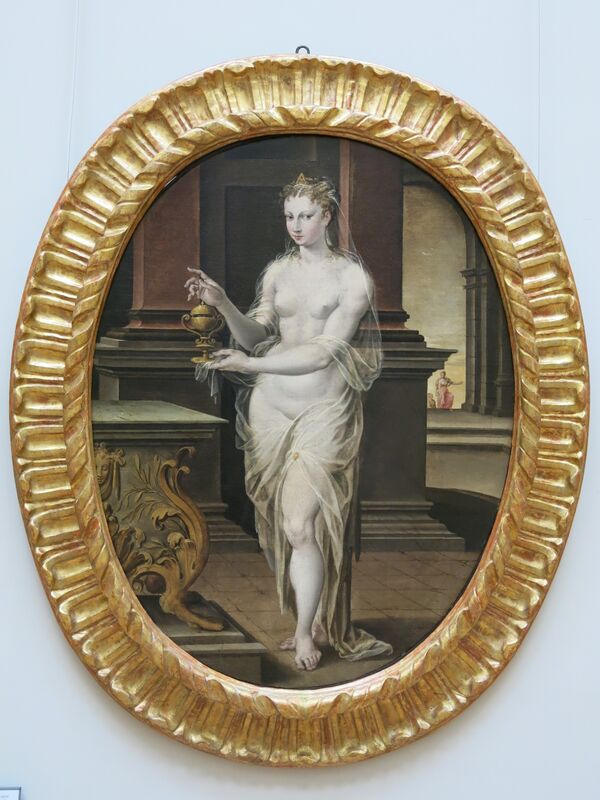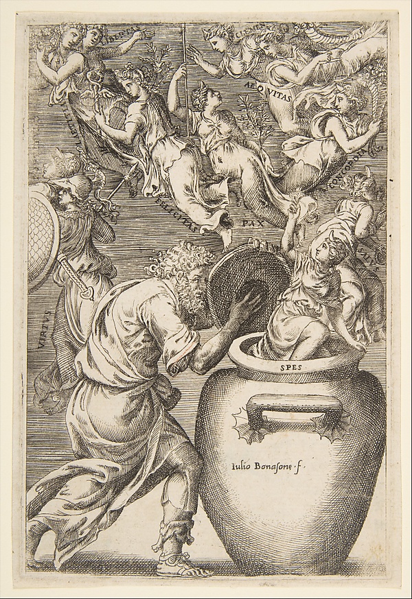 Идея о заключённых в сосуд благах отображена и в ренессансной гравюре Джулио Бонасоне, где виновником произошедшего является супруг Пандоры Эпиметей. Он держится за крышку большого сосуда, из которого в воздух взлетают женские изображения римских добродетелей. Они идентифицируются их названиями на латыни: безопасность (salus), согласие (concordia), справедливость (aequitas), милосердие (clementia), свобода (libertas), счастье (felicitas), мир (pax), стойкость (virtus) и радость (laetitia). Надежда (spes) задерживается на крае сосуда и держит высоко цветок, который служит её атрибутом[17].
