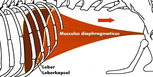 Гортань лежит на широком щитообразном теле подъязычной кости и соединена c ней связкой. Прямая трахея делится на два бронха, каждый из которых входит в легкие в центре на нижней стороне. Легкие крупные, устроены сложно, вмещают большой запас воздуха; с помощью лёгких крокодил способен регулировать плавучесть. Часть мышц, окружающих лёгкие, используется для перемещения воздуха в лёгких, а вместе с ним и центра плавучести[33]. Брюшная полость крокодилов отделена от грудной клетки диафрагмой. Однако эта диафрагма отличается от диафрагмы млекопитающих — у крокодилов она образована соединительнотканным и мышечным сращением между желудком, печенью и плеврой легкого. Приводится в действие с помощью печёночного насоса, в котором печень и свободно соединённые с тазом лобковые кости двигаются в переднезаднем направлении, меняя центр тяжести тела, что также участвует в регуляции плавучести и позволяет крокодилу принимать более удобное положение во время движения в воде и когда он охотится, прячась под водой.