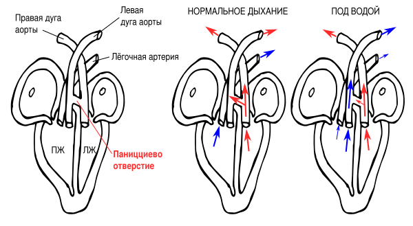 В нормальном режиме работы сердца часть артериальной крови попадает в открытое паниццево отверстие и поступает из правой дуги аорты в левую дугу аорты. Это наиболее выражено во время диастолы. Артериальная кровь также может перемещаться между обеими дугами аорты через анастомоз позади сердца. Давление в правой дуге аорты выше, чем в легочной артерии, и поэтому венозная кровь из правого желудочка не может преодолеть клапан, находящийся на пути из правого желудочка в левую дугу аорты. То есть, когда крокодил активен и не находится под водой, обе дуги аорты несут артериальную кровь и никакого смешивания артериальной и венозной крови не происходит. В этом случае сердца крокодилов работает также, как и сердца млекопитающих и птиц. Однако, за счёт наличия специального клапана, который может плотно перекрывать легочную артерию, крокодилы обладают дополнительным механизмом, позволяющим искусственно нагнетать бедную кислородом венозную кровь из правого желудочка в левую дугу аорты, что приводит к смешиванию артериальной и венозной крови. При перекрытии легочной артерии зубцовым клапаном, насыщенная углекислым газом кровь течет справа налево — из правого желудочка в левую дугу аорты, на фоне того что в норме, наоборот, насыщенная кислородом кровь течет слева направо — из правой дуги аорты в левую через паниццево отверстие. Этим так называемым зубцовым клапаном крокодилы могут управлять по своей воле. Данный механизм, называемый контролируемым шунтированием, имеет важные физиологические функции. Во-первых, вместе со снижением частоты сердечных сокращений, данный механизм играет роль во временном понижении уровня обмена веществ, что необходимо для снижения потребления кислорода при погружении под воду. Во-вторых, при длительном погружении зубцовый клапан выступает в качестве предохранительного клапана, когда избыточное давление в легких вызывает застой крови в легочной артерии и повышенное давление в легочной вене, чтo распространяется на левый желудочек и правую аорту[34]. В-третьих, для ускорения пищеварения кровь в левой дуге аорты, ведущей к пищеварительной системе, сменяется с артериальной на венозную, насыщенную углекислотой, что приводит к выработке желудочного сока, по кислотности десятикратно превосходящего нормальный для млекопитающих[35].