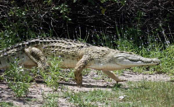 На суше крокодилы довольно медлительны и неуклюжи, но некоторые виды способны иногда предпринимать значительные переходы, удаляясь от водоёмов на несколько километров, и даже охотиться на суше. Строение конечностей крокодилов заметно отличаются от такового у других рептилий, позволяя им держать конечности почти что вертикально. Они имеют два основных способа наземной локомоции: простое ползание на животе и так называемую «высокую походку». «Высокая походка» более свойственна меньшим по размерам крокодилам. Она во многом напоминает способ передвижения млекопитающих, с той же последовательностью движения конечностей: левая передняя, правая задняя, правая передняя, левая задняя. Некоторые настоящие крокодилы и молодые гавиалы порой даже переходят на галоп, на короткие дистанции развивая скорость свыше 17 км/ч[9]. Ползание более свойственно крупным и тяжелым крокодилам. Оно не сильно отличается от метода передвижения саламандр и ящериц. Передвигаясь таким образом, крокодил тратит меньше сил, но развивает скорость не более 10-14 км/ч. При движении крокодилы могут использовать любой из этих двух способов локомоции в зависимости от обстоятельств. В отличие от большинства других наземных позвоночных, когда крокодилы разгоняются, они увеличивают скорость, при которой нижняя половина каждой конечности перемещается вперёд; таким образом длина шага увеличивается, а продолжительность шага уменьшается. Это позволят крокодилам практически мгновенно развить свою максимальную скорость бега и застать свою жертву врасплох[46].