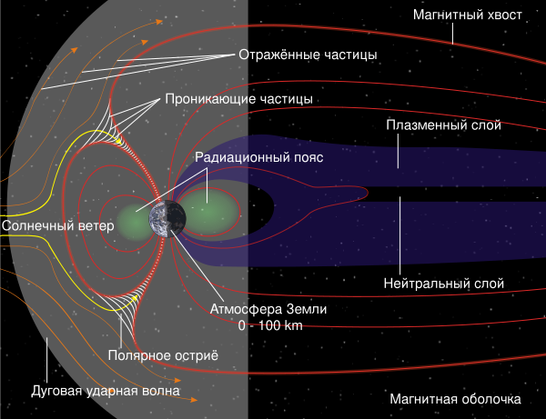 Из восьми планет Солнечной системы лишь у двух магнитосфера практически отсутствует — это Венера и Марс[59]. Для сравнения, она есть даже у одного из спутников Юпитера — Ганимеда. Из намагниченных планет — магнитосфера Меркурия самая слабая, и едва-едва в состоянии отклонить солнечный ветер. Ганимедово магнитное поле в несколько раз мощнее, а юпитерианское самое мощное в Солнечной системе (такое мощное, что может представлять серьёзный риск для будущих возможных пилотируемых миссий к спутникам Юпитера). Магнитные поля других планет-гигантов примерно равны по мощности земному, но их магнитный момент значительно больше. Магнитные поля Урана и Нептуна сильно наклонены относительно оси вращения и смещены относительно центра планеты[59].