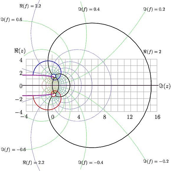 Из определения следует, что суперлогарифмическая зависимость есть обратная функция для функции поэтому, если существование и единственность аналитического расширения тетрации обеспечивается условиями асимптотических подходов к фиксированным точкам и [6] в верхней и нижней частях комплексной плоскости, то обратная функция тоже должна быть уникальной. Такая функция вещественна на реальной оси. Она имеет два экстремума в точках и Она приближается к своему предельному значению в окрестности отрицательной части реальной оси (вся полоса между разрезами показана розовыми линиями на рисунке) и медленно растёт вдоль положительного направления реальной оси. Поскольку производная на реальной оси положительна, мнимая часть остаётся положительной чуть выше реальной оси и отрицательной чуть ниже реальной оси.