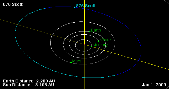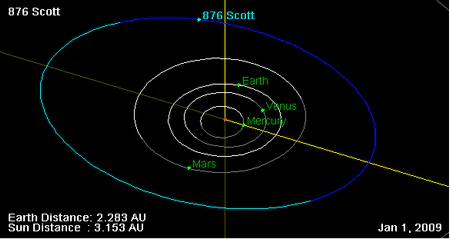 Скотт не пересекает орбиту Земли и делает полный оборот вокруг Солнца за 5,23 лет.