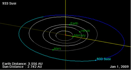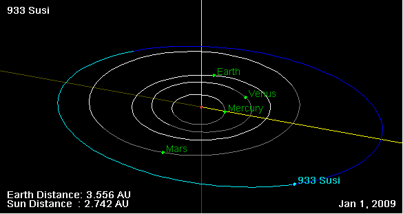 Сюзи не пересекает орбиту Земли, и делает полный оборот вокруг Солнца за 3,65 Юлианских лет.