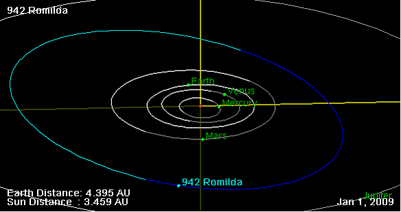 Ромильда не пересекает орбиту Земли, и делает полный оборот вокруг Солнца за 5,60 Юлианских лет.[1]