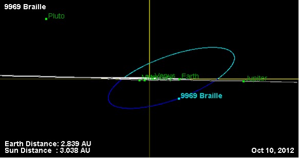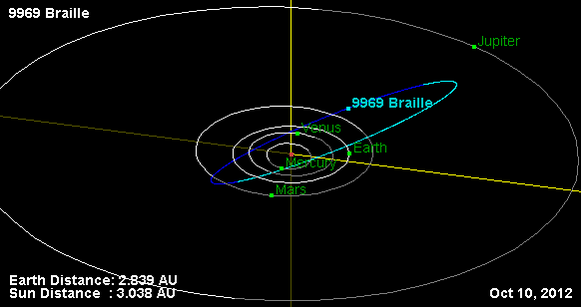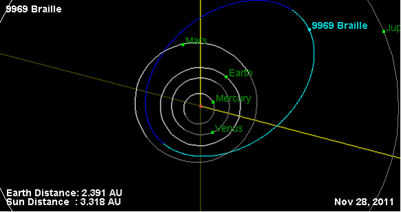 Астероид (9969) Брайль вращается вокруг Солнца по наклонной сильно вытянутой орбите, пересекающей орбиту Марса, из-за чего в своём перигелии (1,335 а. е.) он оказывается ближе к Солнцу, чем Марс (1,381 а. е.), а его афелий располагается как раз в центре пояса астероидов, почти на полпути к Юпитеру. Если бы эти параметры были меньше, то данный астероид можно было бы отнести к группе Амуров.
