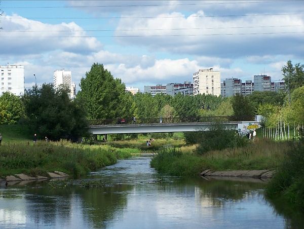 Вверх по течению Яузы, практически до моста Енисейской улицы, располагается рекреационная зона и два пешеходных моста . Первый — бетонный — соединяет улицу Молодцова и Староватутинский проезд. Выходы на Сухонскую улицу и Олонецкий проезд. Движения автотранспорта по мосту нет — во избежание этого при въезде на него установлены бетонные блоки. Мост однопролётный, железобетонный. Ширина приблизительно 8 метров, длина — около 50 метров. Около моста, со стороны улицы Сухонская, часто проводятся так называемые Ярмарки выходного дня.