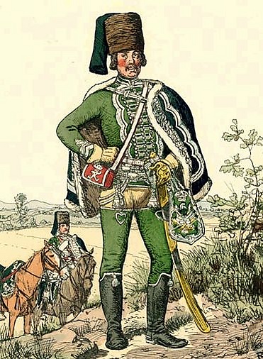Басби с тёмно-зелёным шлыком, «канареечно-зелёный» (светло-, жёлто-зелёный) доломан и sharawaden, белые пуговицы и галун, тёмно-зелёный ментик с белым мехом, малиновый кушак с белыми вставками, «канареечно-зелёная» ташка с белым галуном, тёмно-зелёный чепрак с «канареечно-зелёными» «волчьими зубами», отделанные белой выпушкой[1].