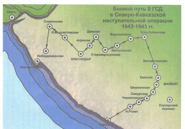 В декабре 1942 года полк переброшен из Батуми в Сухуми далее своим ходом в Лазаревскую, оттуда в горы для соединения со своей дивизией. Затем — освобождение городов и сел Кубани от фашистов: Нефтегорская, Апшеронская, Ханская, Белореченская, форсировали р. Кубань освободили Васюринская, Воронежская, Корсунская, совхоз «Агроном», Динская. Полк участвовал в освобождении Краснодара и водрузил Красное Знамя над зданием Крайкома. Участвовал в освободительном походе по землям Польши и Чехословакии.