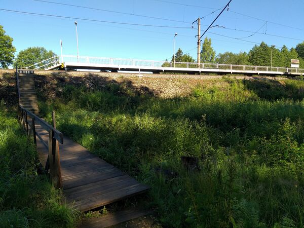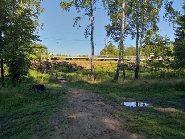Согласно первоначальному проекту, трасса железной дороги Санкт-Петербург — Витебск должна была пройти восточнее места, где сейчас расположен остановочный пункт 117 км. Предполагалось, что обогнув с западной стороны болото Песочный мох[9], железная дорога далее будет следовать в юго-западном направлении восточнее озера Антоново. Однако владельцы усадьбы Надбелье, через чьи земли должна была пройти стальная магистраль, наотрез отказались продавать часть своей территории под строительство железной дороги. В итоге пришлось внести существенные изменения в проект, так, чтобы дорога огибала озеро Антоново с западной стороны. Изменённая трасса железной дороги делает у восточной границы болота Песочный мох поворот почти на 90 градусов и, огибая с юго-востока деревню Веретье, следует на юго-запад до Торковичей и далее на юг по мосту через реку Оредеж между озёрами Антоново и Хвойлово.