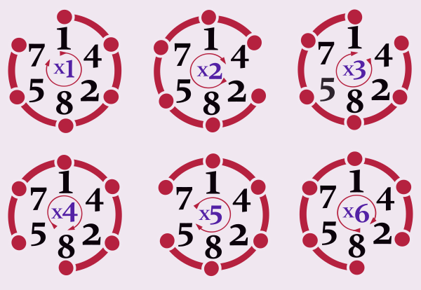Если 142 857 умножать на 2, 3, 4, 5 или 6, результаты будут образованы циклическим сдвигом самого числа 142 857[2].