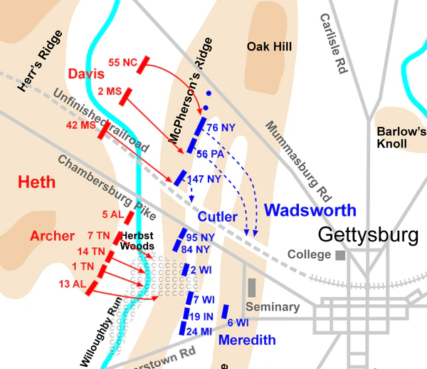 Когда началась Геттисбергская кампания, бригада Катлера была частью I корпуса и первой пришла на поле боя под Геттисбергом. 147-й был третьим полком, который пришёл на поле боя. В это время корпусной командир Рейнольдс приказал разместить на хребте Макферсона батарею Холла, а генералу Уодсворту приказал обеспечить её прикрытие. Уодсворт приказал Катлеру взять три полка (147-й, 56-й Пенсильванский и 76-й Нью-Йоркский) и занять позицию на правом фланге, к северу от Чамберсбергской дороги и железнодорожной выемки. 76-й и 56-й перешли дорогу, и как раз в этот момент по дороге пошла батарея Холла, что задержало выдвижение 147-го. Затем полк перешёл дорогу и занял позицию между выемкой и левым флангом 56-го полка. В это самое время показался противник — бригада Дэвиса[1].