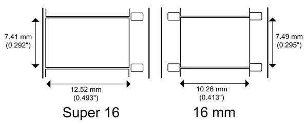 При шаге перфорации 7,62 мм (для позитивной киноплёнки) размер стандартного кадра формата 16-мм составляет 10,05×7,45 мм[7]. Размеры кадрового окна кинопроектора несколько меньше: 9,45×7,05 мм[8]. Соотношение сторон экрана такого фильма близко академическому и составляет 1,34:1. Перфорация располагается напротив межкадровых промежутков, а её шаг совпадает с шагом кадра. Первая 16-мм киноплёнка выпускалась только с двухсторонней перфорацией. В 1932 году в связи с распространением звукового кино от одного ряда перфораций отказались, и вся аппаратура стала поддерживать одностороннюю перфорацию[9][10]. С двухсторонней перфорацией поставляются киноплёнки, не предназначенные для печати фильмокопий с фонограммой и пригодные для высокоскоростной киносъёмки[11]. Некоторые негативные и обращаемые сорта с односторонней перфорацией снабжались двумя магнитными дорожками: широкой, расположенной на месте отсутствующего ряда перфорации, и узкой «балансировочной» с противоположного края. В СССР 16-мм киноплёнка получила широкое распространение, а расположение кадра и фонограммы на фильмокопиях регламентировались по ГОСТ 25704-83[12].