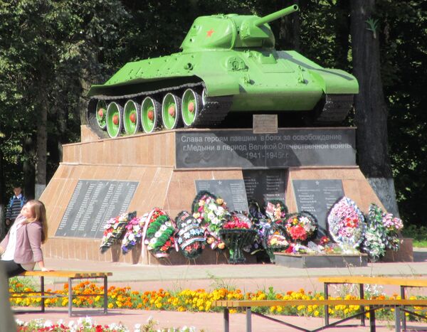 - Танк Т-З4 из состава 17-й танковой бригады, затонувший в реке Шаня, после войны был доставлен и установлен как памятник на постамент в центре Медыни[5].