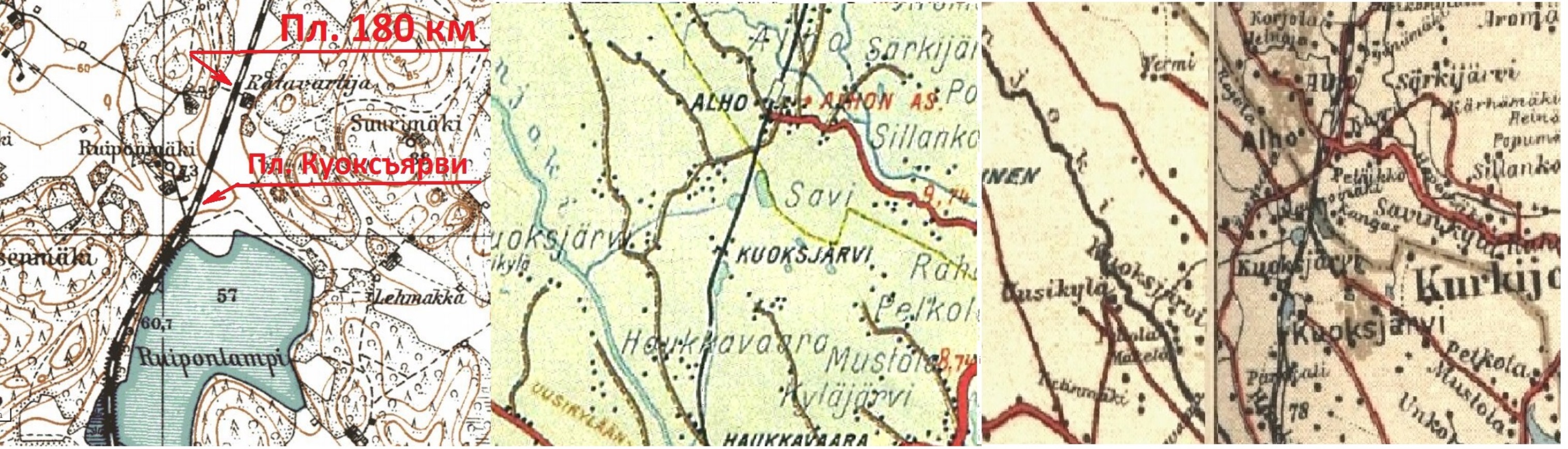 В 400 метрах южнее дома путевого сторожа и советской платформы 180 км (в сторону Хийтолы, на современном 179,5 км)61°17′27″ с. ш. 29°41′59″ в. д.GЯO, располагалась платформа Куоксъярви (фин. Kuoksjärvi). Она была открыта 1 сентября 1932 года и обеспечивала транспортное обслуживание многочисленных финских хуторов, объединённых общим названием Kuoksjärvi, разбросанных в радиусе порядка 6 км западнее железнодорожной линии[4].