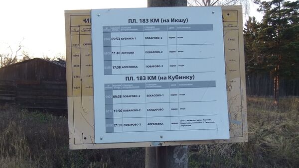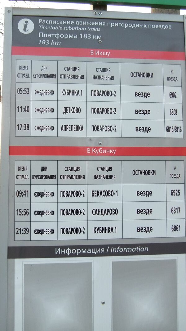 Время движения поезда со станции Кубинка-1 — 35 минут. На платформе останавливаются ежедневно 3 пары электропоездов в каждую сторону: на север до Поварово-2, на юг до Бекасово-1, Сандарово и Апрелевки.