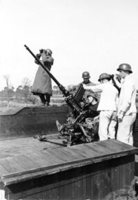 Компания «Хадсон» опережала производственный план по выпуску пушек во много раз[12]. При заводе «Понтиак» была организована общевойсковая школа подготовки технических специалистов по эксплуатации и обслуживанию зенитной артиллерии типа «Эрликон» и «Бофорс».[13] Кроме того, инженерами «Понтиак» был внесён ряд мелких конструктивных изменений по просьбам военнослужащих, в частности переделан плечевой упор для лучшего поглощения отдачи, а также задняя стойка прицела для прицеливания левым глазом[14]. в ВеликобританииКонтрафактное производство схожей по конструкции пушки было налажено[когда?] британским контрабандистом Деннисом Кендаллом на заводе в Грантеме, графство Линкольншир[источник не указан 2847 дней], для оснащения истребителей Королевских военно-воздушных сил Великобритании[15]. РазвитиеК 1927 году фирма «Эрликон» разработала и поставил на конвейер модель, названную Эрликон S (тремя годами позже ставшую просто 1S). Пушка создана под более мощный патрон 20×110 мм и характеризовалась более высокой начальной скоростью снаряда 830 м/с, что сопровождалось увеличением массы конструкции и снижением скорострельности до 280 выстрелов в минуту. В 1935 швейцарцы сделали ещё один качественный шаг в развитии авиапушек. Новый вид пушки «Flügelfest» (flügelfest — «крыльевая» модификация пушки) получил три варианта, под обозначениями «FF», «FFL» и «FFS». Улучшением в пушках стало снижение массы изделия, увеличение скорострельности и начальной скорости снаряда. Впрочем, перезарядка в воздухе пока что оставалась труднопреодолимым препятствием, поэтому боекомплект был увеличен путём прямого увеличения ёмкости магазинов. Изготавливались варианты на 45, 60, 75 и 100 патронов, из которых самым ходовым стал 60-патронный вариант. В 1930-е годы ряд фирм разных стран приобрёл лицензию на новые эрликоны. Французская «Испано-Сюиза» начала выпускать свою модификацию «FFS». Германия развила эрликон FF до весьма удачной модели авиапушки MG FF. Японский императорский флот принял на вооружение «эрликоны» Типа 99-1 и 99-2, представлявшие собой развитие моделей «FF» и «FFS». ОператорыПрименение в вооруженных конфликтах и войнахВторая мировая войнаЭрликон на борту корабля ВМС Британии Hermione, 1942 год. Качественно улучшенную серию «FFS» «Эрликон» запустил в 1938 году (Эрликон-SS). Эта модель и особенно её разновидности периода уже Второй мировой войны (1SS — 1942, 2SS — 1945) выдавали скорострельность до 650 выстрелов в минуту. Данная модель массово применялась на кораблях американского и английского флотов в качестве зенитного орудия. Также, модифицированный вариант монтировался в открытой вращающейся турели на тихоходном противолодочном самолёте — «охотнике за подводными лодками», в качестве его основного стрелково-пушечного вооружения[17]. В ходе Второй мировой войны выявилась низкая эффективность зенитных автоматов калибра 20—25 мм. Поражающее действие малокалиберного снаряда «Эрликона» было слишком незначительным и недостаточным для надёжного уничтожения даже истребителя, не говоря уже о бомбардировщиках, а скорострельность автоматов того времени не обеспечивала требуемую плотность огня. Дальность стрельбы позволяла обстреливать авиацию лишь на ближней дистанции, часто после того, как самолёты уже применили своё оружие. Уже в 1943 году одиночный зенитный автомат признавался недостат