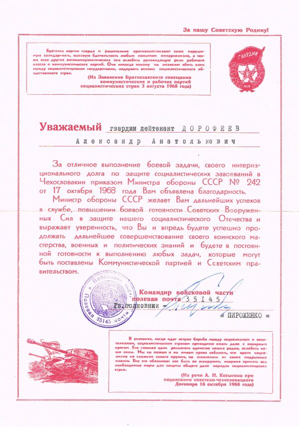 Приказом Министра обороны СССР от 17 октября 1968 года № 242 за образцовое выполнение задания командования и интернационального долга по оказанию помощи трудящимся Чехословакии в борьбе с контрреволюционными элементами и проявленные при этом отвагу и мужество всему личному составу дивизии, участникам операции «Дунай» объявлена благодарность.