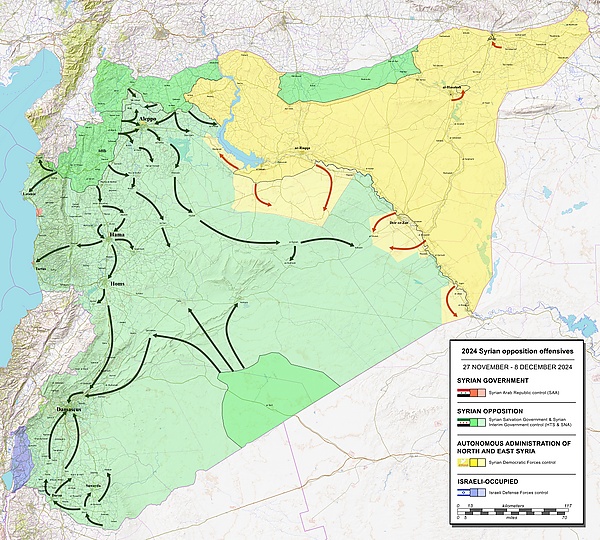 - Президент Сирии Башар Асад покинул страну, что ознаменовало прекращение существования Сирийской Арабской Республики и падение династии Асадов, правившей 53 года[85]. Сирийская оппозиция начала формирование переходного правительства[86].