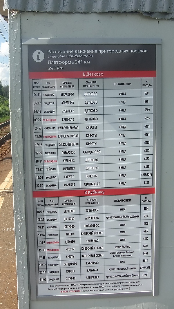 Среднее время в пути электропоезда от 241 км до Бекасово-1 — 26 минут. До Москвы-Киевской — 1 час 47 минут. До станции Столбовая — 52 минуты.