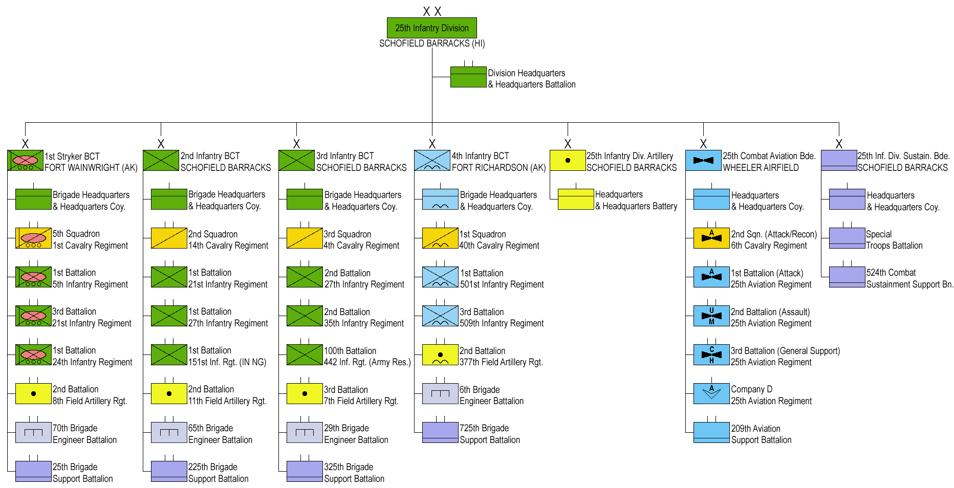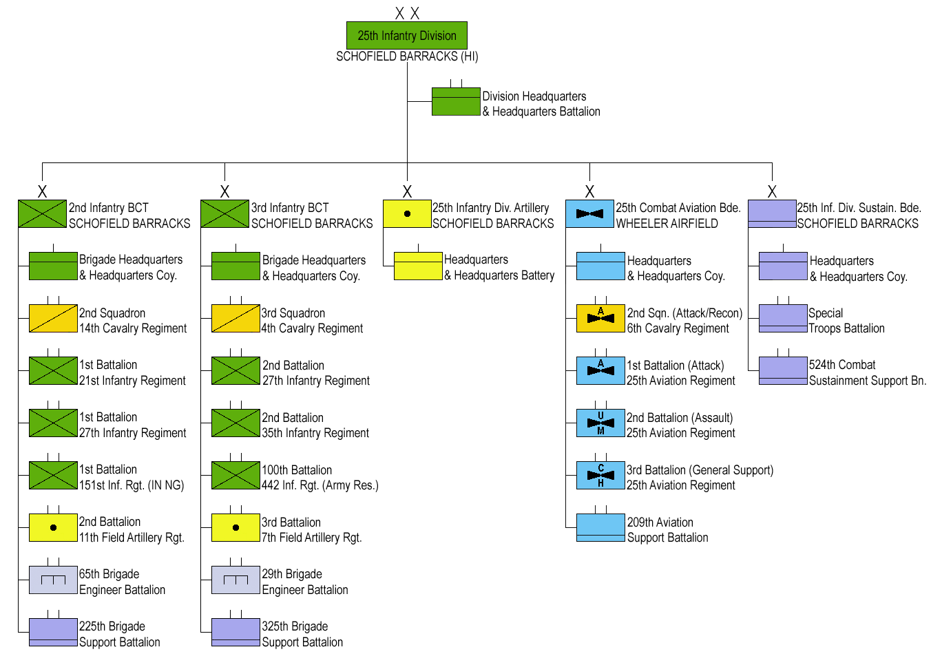 В 2000-х годах 25-я пехотная дивизия принимала участие в боевых операциях Вооружённых сил США за рубежом. В 2004—2005 годах одна бригада из её состава находилась в Афганистане. В 2005 году в состав дивизии была включена воздушно-десантная бригада, осенью 2006 года отправленная в Ирак.