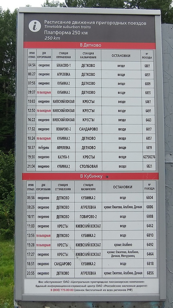 Среднее время в пути электропоезда от 250 км до Бекасово-1 — 28 минут. До Москвы-Киевской — 1 час 47 минута (с заходом в Бекасово-1 — 2 часа 1 минута). До станции Столбовая — 46 минут.