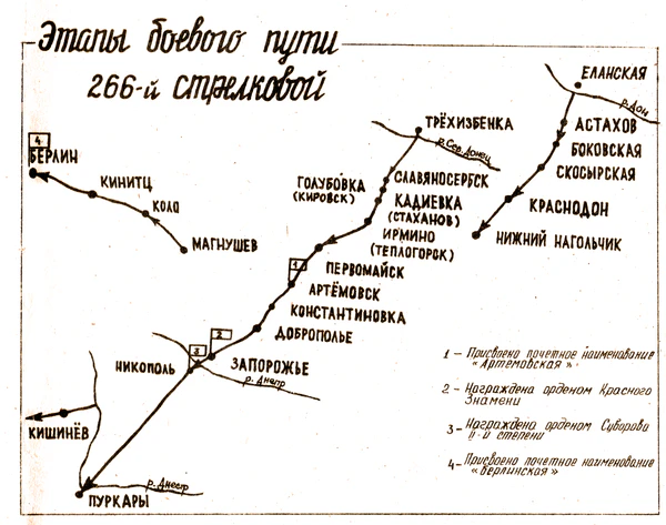 Апрель 1945 года. 266-я стрелковая дивизия вместе с другими частями стремительно наступала на Берлин. 22 апреля она ворвалась в один из пригородов фашистской столицы. Штурм Берлина длился десять дней и ночей. Перед штурмом городской ратуши была поставлена задача водрузить над ней Красное знамя. Это осуществил комсорг 1010-го полка младший лейтенант Пётр Бутко, за что ему было присвоено звание Героя Советского Союза.