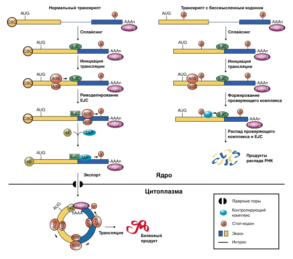 NMD (англ. nonsense-mediated decay) является действенным механизмом разрушения нефункциональных мутантных транскриптов. Обычно в этом механизме эффективность определяется расположением мутации относительно места соединения экзонов, однако 3′-UTR также может иметь некоторое значение. Механизм терминации трансляции на преждевременных стоп-кодонах зависит от расстояния между терминаторным кодоном и поли(А)-связывающим белком PABPC1. Показано, что увеличение расстояния между стоп-кодоном и поли(А)-хвостом приводит к запуску NMD, а изменения в пространственной структуре 3’-UTR могут модулировать NMD[8].