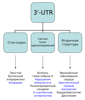 Мутации, затрагивающие 3′-UTR, имеют важное значение, поскольку одна такая мутация может сказаться на экспрессии многих генов. Хотя на уровне транскрипции мутации влияют на конкретный аллель и физически сцепленные гены, поскольку связывающиеся с 3′-UTR белки также принимают участие в процессинге и экспорте МРНК из ядра. Таким образом, мутация может влиять на несвязанные гены [32]. Так, мутации, произошедшие в ARE, приводят к сбою в работе ARE-связывающих белков, в результате чего могут развиться такие заболевания, как злокачественные перерождения кроветворных органов и лейкемия[33][34]. Повышенное содержание тринуклеотида CTG в 3′-UTR гена миотониновой протеинкиназы вызывает миотоническую дистрофию. Вставка ретротранспозона длиной 3 килобаз, состоящего из тандемных повторов, в 3′-UTR гена белка фукутина, связана с врожденной мышечной дистрофией типа Фукуяма[29]. Изменения в элементах, локализованных в 3′-UTR, связаны с развитием таких заболеваний человека, как острый миелоидный лейкоз, альфа-талассемия, нейробластома, кератинопатия, аниридия, синдром IPEX, врождённые пороки сердца[31]. Связь некоторых из этих заболеваний с конкретными элементами 3′-UTR представлена на схеме ниже.