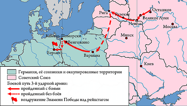 В ходе Великой Отечественной войны войсками 3-й ударной армии были освобождены города: