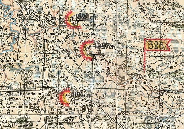 9 ноября 1941 года 326-я сд прибыла в район станции Селикса (Пензенская область) и расположилась в Мертовщине и ряде населённых пунктов вокруг последней. В районе Селикса размещалась 37-я запасная стрелковая бригада, куда предположительно был сдан сверхштатный личный состав. Напомню, что 326-я сд ушла из Саранска с большим количеством сверхштатной численности личного состава – 13600 человек против 10859 человек по штату №04/600 от 29 июля 1941 года (превышение на 21 %).