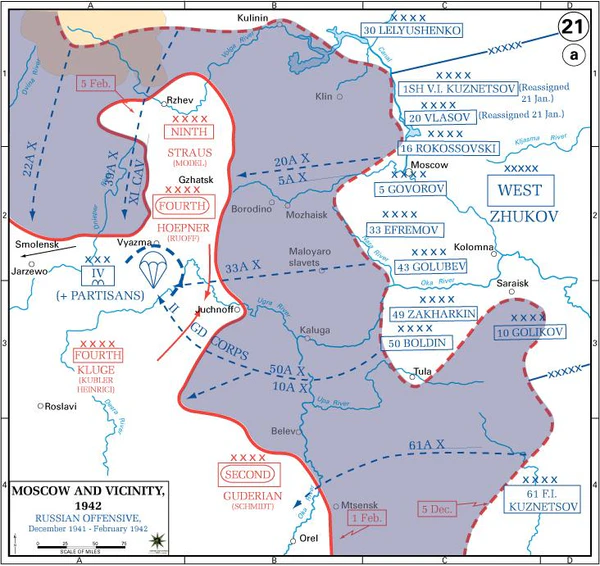 8 января 1942 года без оперативный паузы после контрнаступления началась Ржевско-Вяземская операция — завершающий период битвы под Москвой. В операции участвовали Калининский, Западный при содействии Северо-Западного и Брянского фронтов. Цель её состояло в том, чтобы разгромить главные силы немецко-фашистской группы армий «Центр»[29].[30]