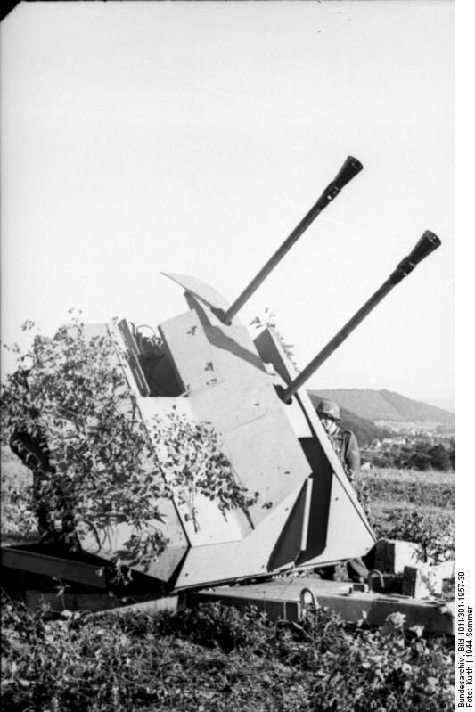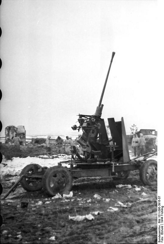 В Германии, уделявшей большое значение развитию зенитной артиллерии, в период Второй мировой войны имелось несколько образцов 37-мм автоматических зенитных пушек. В 1935 году была принята на вооружение пушка 3,7 cm FlaK 18 фирмы «Рейнметалл», однако её серийное производство продолжалось недолго — военные не были довольны её четырёхколёсной повозкой, считая её слишком громоздкой. В результате произведённых доработок в серию пошла пушка 3,7 cm FlaK 36, отличавшаяся от Flak 18 двухколёсной повозкой с отделяемым ходом и рядом изменений в устройстве автомата. По сравнению с советским орудием, немецкое имело более слабую баллистику — более лёгкий снаряд, меньшую начальную скорость. В то же время немецкое орудие имело меньший вес в боевом положении, но больший — в походном. С 1943 года серийно выпускался новый зенитный автомат — 3,7 cm FlaK 43. Созданный на базе Flak 36, при той же баллистике он имел принципиально новую схему автоматики. По сравнению с советским орудием, Flak 43 имел несколько большую практическую скорострельность. Помимо одиночных установок, использовались и спаренные орудия Flakzwilling 43 как с вертикальным, так и с горизонтальным расположением стволов[109].