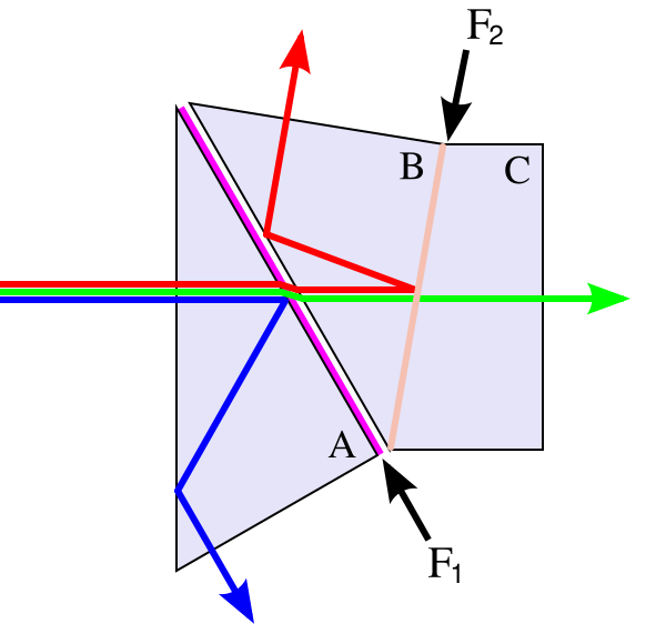Свет от съёмочного объектива попадает на цветоделительную дихроичную призму, разделяющую его на три составляющих потока, направляемых к разным граням призмы. Излучение с самой короткой длиной волны избирательно отражается от дихроичного покрытия F1, пропускающего остальной свет дальше. Так синяя составляющая света направляется к нижней выходной грани. Затем поверхностью с покрытием F2 отделяется длинноволновая — красная часть спектра, попадающая к верхней выходной грани. Оставшийся свет, прошедший через все покрытия, соответствует зелёной части спектра и попадает к задней выходной грани призмы. Таким образом получаются три монохромных действительных изображения объекта съёмки. Красный и синий свет претерпевает двукратное отражение, в результате чего получаются прямые (незеркальные) изображения этих цветов. Каждое из этих цветоделённых изображений попадает на отдельную матрицу, видеосигнал с которых после обработки добавляется к общему. В результате сложения сигналов с трёх матриц получается полный цветной телевизионный сигнал.
