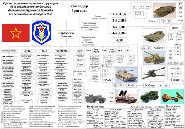 Штатная численность личного состава 56-й гв. одшбр на 1 декабря 1986 составляла 2452 человека (261 офицер, 109 прапорщиков, 416 сержантов, 1666 солдат)[5].