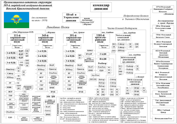 От дивизии остались в Фергане 345-й отдельный гвардейский парашютно-десантный ордена Суворова полк значительно большего состава (к нему был добавлен гаубичный артиллерийский дивизион), чем обычный и 115-я отдельная военно-транспортная авиационная эскадрилья.