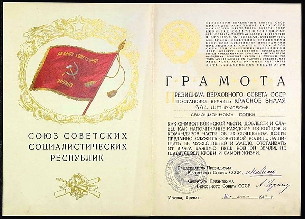 594-й штурмовой авиационный Гдыньский полк за образцовое выполнение заданий командования в боях с немецкими захватчиками при овладении городами Пренцлау, Ангермюнде — важными опорными пунктами обороны немцев в Западной Померании и проявленные при этом доблесть и мужество Указом Президиума Верховного Совета СССР от 4 июня 1945 года награждён орденом Суворова III степени[4].