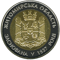 На реверсе монеты изображён герб области и по кругу расположены надписи: «ЖИТОМИРСЬКА ОБЛАСТЬ» (вверху), «ЗАСНОВАНА У 1937 РОЦІ» (внизу).