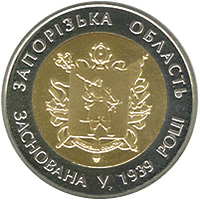 На реверсе монеты изображён герб области, по кругу размещены надписи: «ЗАПОРіЗЬКА ОБЛАСТЬ» (вверху), «ЗАСНОВАНА У 1939 РОЦI» (внизу).