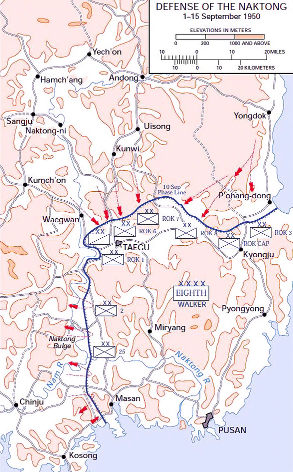 Инчхонская десантная операция, состоявшаяся при участии 10-го корпуса, позволила нанести удар в тыл северокорейским войскам и позволила 1-му корпусу перейти в наступление из Пусанского периметра 16 сентября[17]. Спустя четыре дня войска 1-го корпуса начали всеобщее наступление на север, проламывая оборону северокорейцев и стремясь соединиться с силами 7-й пехотной дивизии, двигавшихся в южном направлении со стороны побережья. В результате наступления были разгромлены основные силы Корейской народной армии, оказавшиеся отрезанными от внешнего мира. 26 сентября к югу от Сувона американские силы соединились[18].