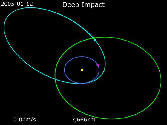 4 июля 2005 года в 9:52 по московскому времени в рамках миссии Дип Импакт на комету был сброшен 370-килограммовый ударник с медным сердечником. Целью данного эксперимента являлось изучение внутренних слоёв ядра и оценка времени его образования. Помимо этого, по мере приближения к ядру, ударник, оснащённый собственными двигателями и фотокамерой, непрерывно фотографировал поверхность. Последний снимок был сделан за три секунды до столкновения, которое произошло на скорости 10,6 км/с. В результате столкновения произошёл взрыв, кинетическая энергия которого была эквивалентна 4,8 тоннам тротила, что привело к образованию 150 м кратера и шестикратному увеличению яркости кометы. А спустя несколько минут после столкновения мимо ядра на расстоянии около 500 километров пролетел зонд и сделал снимки выброшенного шлейфа и ядра кометы в целом, но само место падения импактора оказалось скрыто под облаком пыли.