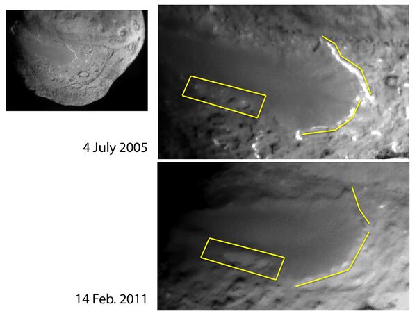 15 февраля 2011 года аппарат пролетел всего в 181 км от ядра кометы[7] и сделал 82 снимка кометы, на некоторых из которых был обнаружен кратер от падения импактора. Как оказалось, кратер имел около 150 метров в диаметре и до 28 метров в глубину. В центре кратера образовалась небольшая насыпь из материала, упавшего обратно после столкновения[8]. Сравнивая место падения до и после столкновения, учёным удалось получить более подробные сведения о составе и структуре ядра кометы.