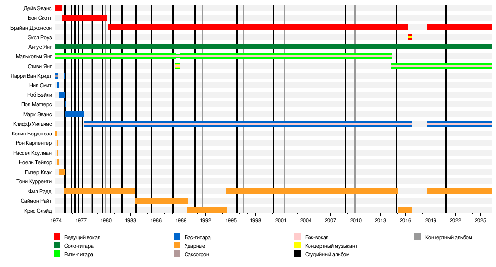 - Малькольм Янг (Malcolm Young) — ритм-гитара, бэк-вокал, иногда соло и бас-гитара (1973—2014; умер в 2017)