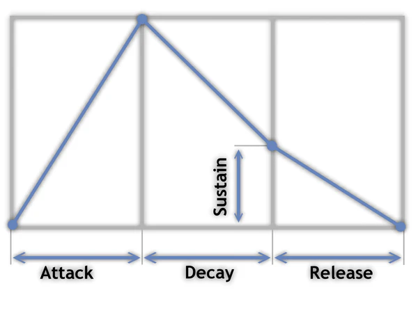 ADSR-огибающая позволяет описывать подобные изменения с помощью небольшого числа параметров, описывающих четыре разные стадии огибающей. Название ADSR является сокращением от названий каждой из этих стадий (Attack-Decay-Sustain-Release).