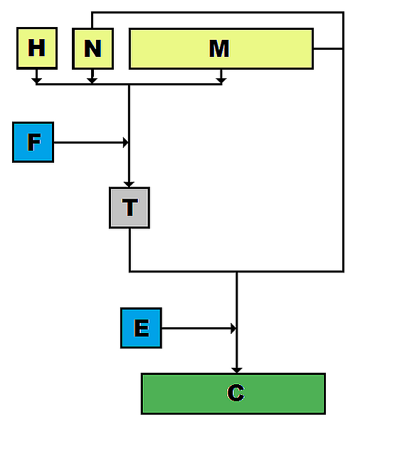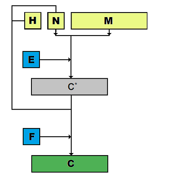 В данном варианте сначала шифруется сообщение M с использованием nonce N, затем заголовок H и зашифрованное сообщение аутентифицируются с помощью MAC с тем же nonce.