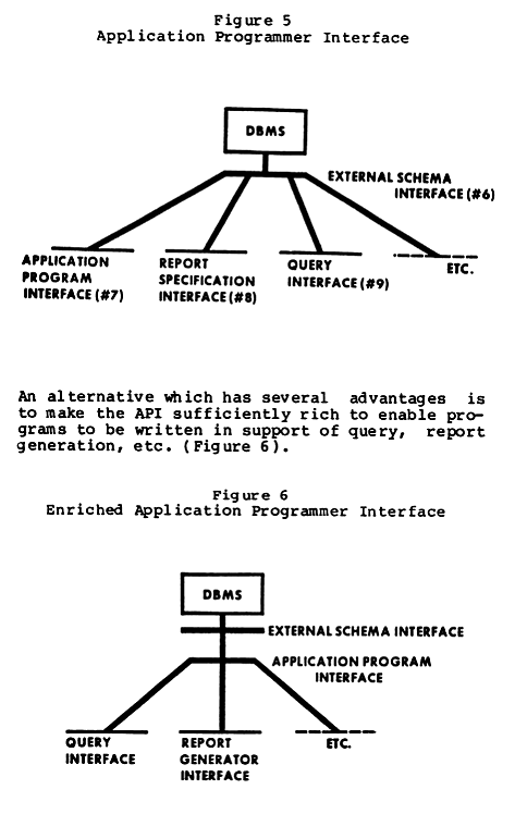 Термин перешёл и в область баз данных благодаря К. Дж. Дейту, который в 1974 году рассматривал API как отдельный интерфейс в системах управления базами данных[12][13]. В ANSI-SPARC API выделен как самостоятельный интерфейс, параллельно с другими, например, языком запросов. Вскоре архитектуру стали строить не вокруг прикладного, а универсального API[9].